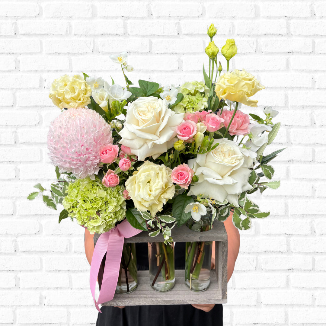 our team of artisan florists will craft each order to represent the colour palette and essence of the product displayed, however, exact flower varieties and composition will vary due to both seasonal and daily availability.