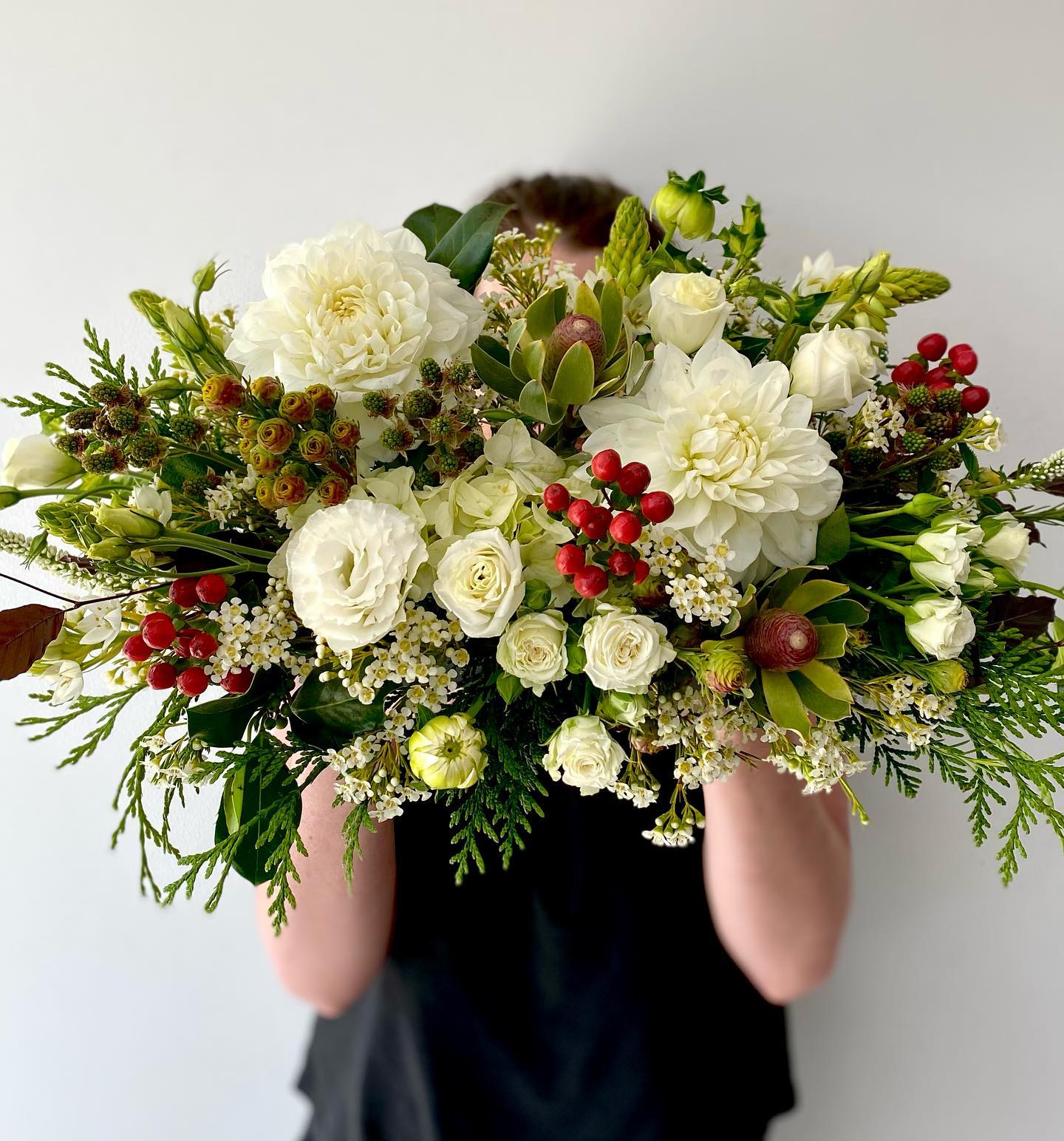 Queen's Scepter is a festive arrangement featuring a vibrant mix of red and white blooms, complemented by seasonal greenery. We carefully select only the freshest, premium-quality flowers from trusted local wholesale suppliers or directly from growers. As flowers are perishable, their lifespan may vary. Each arrangement is one-of-a-kind, designed to reflect the spirit of the featured design, though no two will be exactly the same.