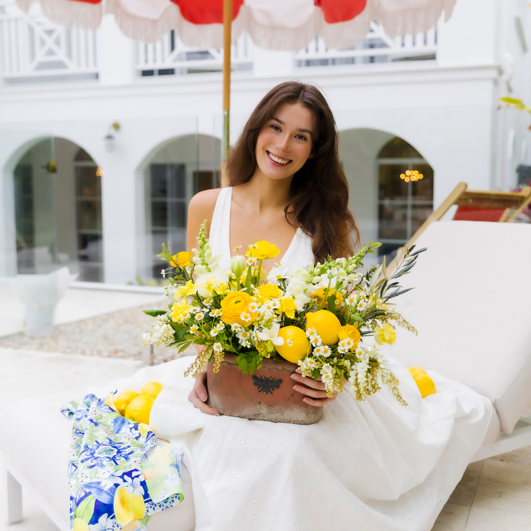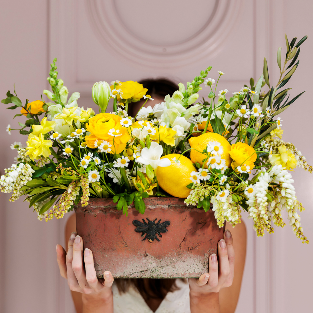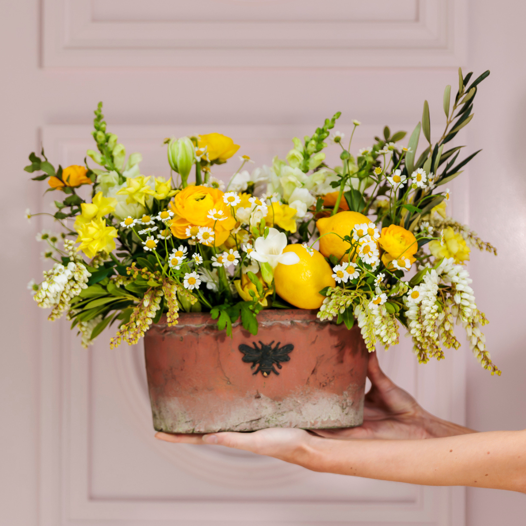 Zesty, radiant, and bursting with joy, this arrangement pairs golden citrus tones with fresh seasonal blooms and citrus fruits, presented in a rustic terracotta trough for a touch of Italian charm. Like its namesake, it’s refreshing, vibrant, and impossible not to smile at — a centrepiece that feels like spring on the Sicilian coast.
