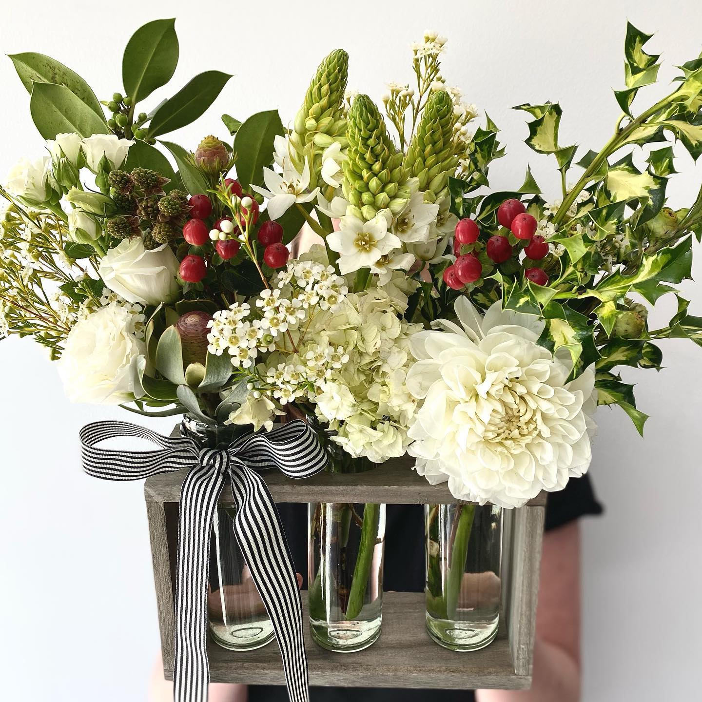 Sovereign Crest features a blend of flowers and foliages, with luxurious textures and holiday accents. Perfect for your holiday decor, this centrepiece will add a touch of Christmas magic to any space.