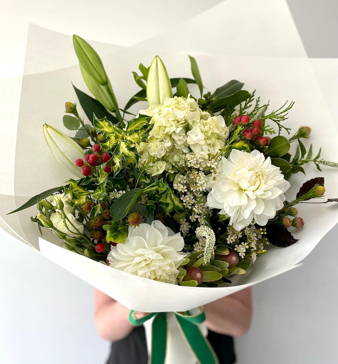 Elevate your holiday decor with our exquisite Crown Imperial bouquet, featuring stunning white and red flowers and lush foliage. Experience the luxurious beauty of this elegant arrangement.