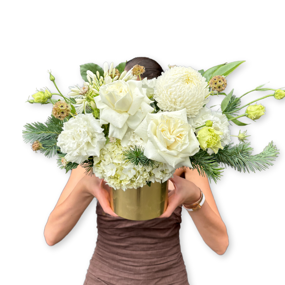 An icy yet graceful bouquet, Empress Grace enchants with a beautiful mix of premium white garden blooms and rich foliages, elegantly displayed in a golden vase..This elegant display adds a touch of serene luxury, ideal for sophisticated celebrations or quiet moments of holiday reflection.