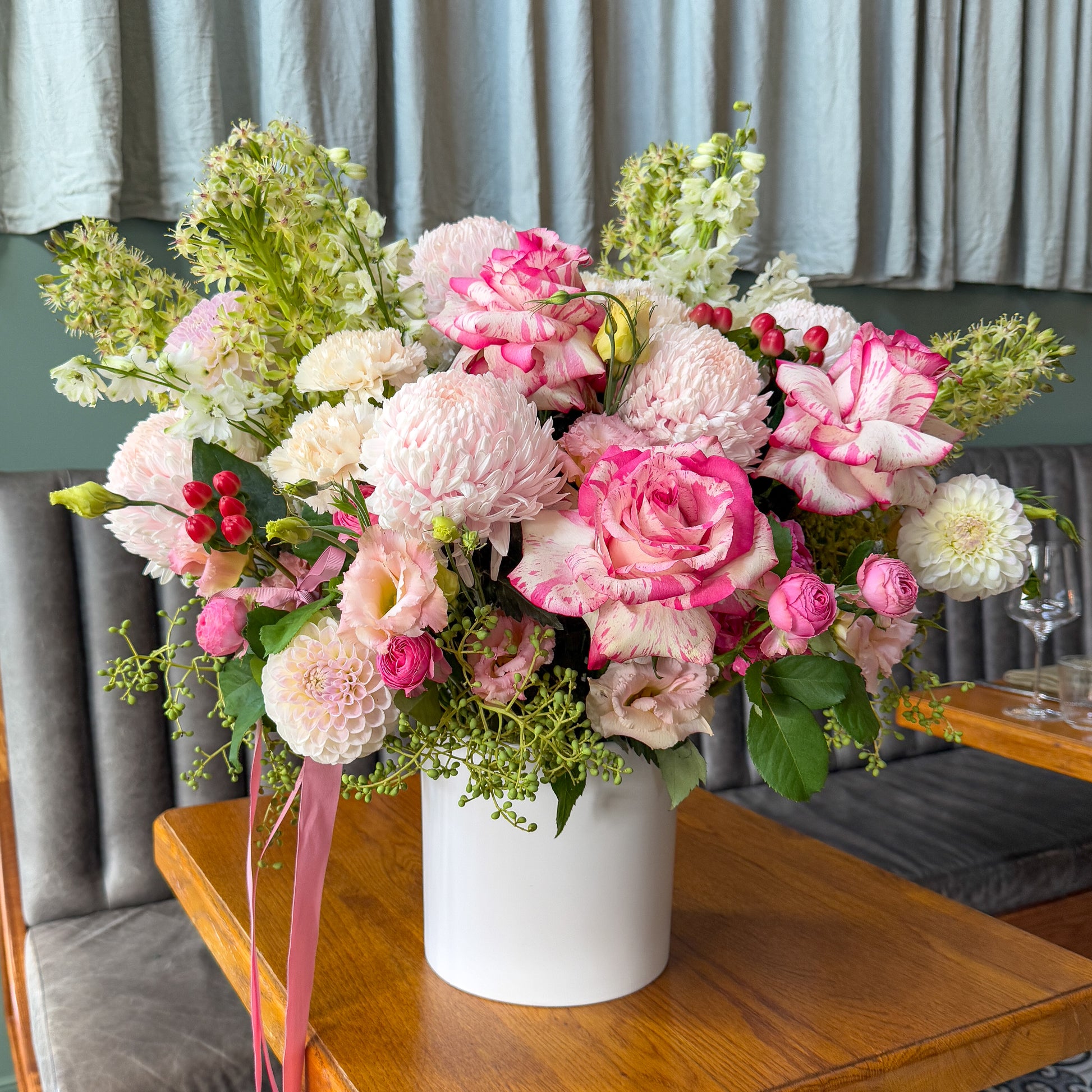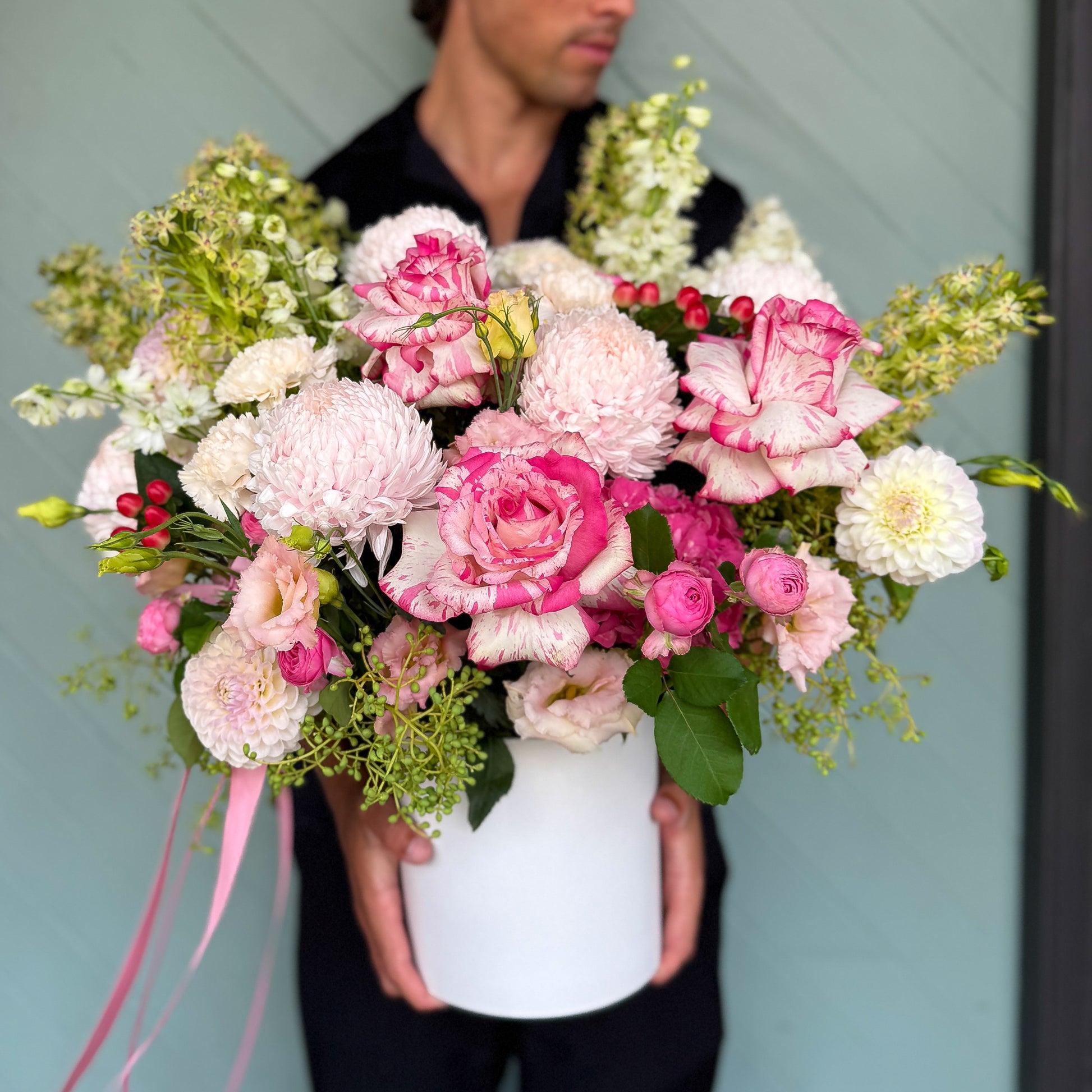 Our team of artisan florists will craft each order to represent the colour palette and essence of the product displayed, however, exact flower varieties and composition will vary due to both seasonal and daily availabilities.