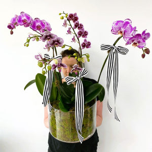 A timeless and elegant arrangement of the divine phalaenopsis orchid. Presented in a moss-lined glass vase and finished with branches, this sculptural piece is long-lasting and requires minimal care.